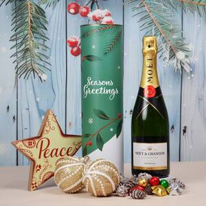 A bottle of Moet & Chandon French Champagne together with a large handful of Chocolatier foil wrapped chocolates in Christmas colours and shapes (stars & baubles).  This gift comes beautifully packed in our custom made "Season's Greetings" Tubes, adding that special seasonal touch, meaning they can go straight under the Christmas Tree!