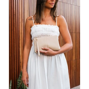 The Louenhide Mimi Biscotti Clutch is a simple everyday clutch style. This compact silhouette can effortlessly transform your style from day to night. Style and wear the webbing wristlet for a more casual everyday look, or interchange for the matching vegan leather wristlet to elevate your event attire. Made from a smooth vegan leather, this casual women's clutch offers ample space for all your essentials.